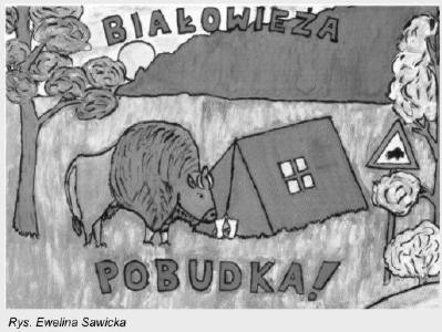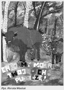 Zapraszamy do nadsyłania na adres redakcji ,,Puszczyka'' Waszych rysunków, obrazów, wyklejanek i rzeźb przedstawiających przyrodę oraz zabytki Puszczy Białowieskiej i Białowieskiego Par-ku Narodowego lub obrazujących Wasze przygody z wycieczek do Puszczy. Swoje prace możecie opatrzyć tytułem. Najciekawsze z nich nagrodzimy i zaprezentujemy w ,,Puszczykowej Galerii". Pozostałe, których ze względu na ograniczoną ilość miejsca nie opublikujemy, będziemy zbierać, po to, aby w przyszłości zaprezentować je na wystawie w Ośrodku Edukacji Przyrodniczej. W pierwszej edycji ,, Puszczykowej Galerii'' prezentujemy prace nagrodzone w konkursie plastycznym pt.: ,,Ludzie i Puszcza Białowieska'', który dwa lata temu zorganizowaliśmy w naszym Ośrodku. Ich autorami są: Alicja Filipkowska z Białowieży oraz Ewelina Sawicka i Renata Wasiluk z Kleszczel. Bardzo ciekawa jest praca Renaty. Na tle namalowanym farbami Renata umieściła żubry wykonane przy użyciu kredek woskowych, plasteliny i wycinanek. Pnie i konary drzew wykleiła paskami kolorowej włóczki. Zachęcamy Was gorąco do udziału w konkursach plastycznych organizowanych przez nasz Ośrodek. Szczegółowe informacje na ich temat będziemy przesyłać Waszym nauczycielom.