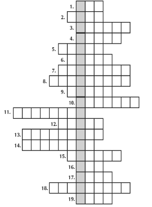Poziomo: 1. kłujące zwierze; 2. ssak - król Puszczy Białowieskiej; 3. gatunek narcyza, spotykany w naszych ogródkach, o żółtych, silnie pachnących kwiatach; 4. czarny ptak z rodziny krukowatych; 5. gatunek drzewa należący do rodzaju topoli; 6. pospolite u nas drzewo iglaste; 7. najpospolitsza sowa Puszczy Białowieskiej; 8. zwierzę, które zimą zmienia futro na białe; 9. podobny do królika, lecz szybciej od niego biega; 10. największa europejska sowa; 11. w Polsce najgroźniejszy jest …… sromotnikowy; 12. pojawiają się wiosną na gałęziach; 13. krzew leśny z rodziny brzozowatych; 14. grupa zwierząt, której wspólną cechą jest posiadanie kostnego kręgosłupa; 15. roślina zielna z rodziny astrowatych, o niebieskich kwitach, rosnąca najczęściej w zbożach; 16. lata ….. koło nosa; 17. podobny do domowej świni, lecz mieszka w lesie; 18. z jej owoców robimy jesienią korale; 19. liście sosny.