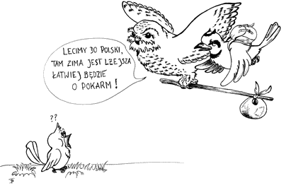Trzecią wreszcie grupę ptaków stanowią gatunki, które lęgną się w naszym kraju, jednak na zimę przesuwają się dalej na zachód i południe, a na ich miejsce przylatują inne osobniki tego samego gatunku z północy i wschodu. Zazwyczaj trudno odróżnić jest „nasze” gawrony, kawki, czyże, sikory czy grubodzioby od tych „przyjezdnych”. Niekiedy jednak wytrawni znawcy ptaków są w stanie określić, czy dany osobnik jest „nasz”, czy też jest „przybyszem”. Ostatniej zimy mieliśmy na przykład inwazję gili z Syberii, które odzywały się innym głosem niż gile gnieżdżące się u nas. Podobnie przed kilku laty Europę Środkową licznie odwiedziły ze wschodu orzechówki, które charakteryzują się dłuższym i smuklejszym dziobem niż nasze. Jedynym ptakiem, który nie tylko odwiedza nas głównie zimą, ale nawet gniazduje w tym czasie, jest krzyżodziób świerkowy. W Puszczy Białowieskiej zawsze rezyduje nieliczna populacja tego gatunku, jednak w latach obfitego urodzaju szyszek świerka krzyżodzioby pojawiają się dużo liczniej. Nasiona świerka, którymi krzyżodzioby karmią swoje młode, zawierają dużo tłuszczu i innych składników odżywczych. Dzięki temu ptaki te mogą wyprowadzać lęgi nawet w grudniu, czyli w okresie, kiedy panują mrozy i śniegi, ale kiedy również jest najwięcej odpowiedniego dla nich pokarmu. KZ |