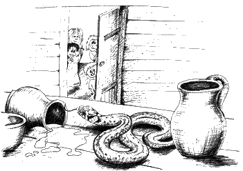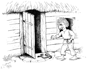 wylęgnie się maleńki zaskroniec. Gdy domownik ocknął się z odrętwienia, co sił pomknął na podwórko, a stamtąd do komory. Zastał mocno zatrzaśnięte drzwi, więc odszukał mysią norkę, przecisnął się do wnętrza i dzbany zaczął wywracać. Kiedy już się zbliżał do ostatniego, drzwi nagle się otworzyły i na progu zjawili się gospodarze z dziećmi. Zajęty zmaganiem z wielkim dzbanem domownik nawet ich nie zauważył, a tym bardziej nie spostrzegł, z jaką wdzięcznością patrzyła nań cała uratowana od niechybnej śmierci rodzina. MH |