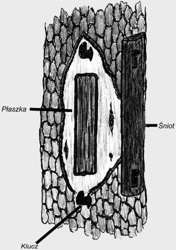 oznaczali swoje barcie znakami. Znak taki, nazywany “ciosnem", był s Jak wyglądała prapuszczańska barć? Początkowo była to naturalna dziupla w drzewie, w której pszczoły zakładały gniazdo . Później ludzie nauczyli się dłubać w drzewach większe otwory, czyli “dziać" barcie. Zadanie takie wymagało wielkiej umiejętności i siły bartnika. Musiał on wspiąć się na drzewo, na wysokość od kilku do kilkunastu metrów. Miejsce jego pracy znajdowało się często aż kilkanaście kilometrów od domu, dlatego nie zabierał ze sobą drabiny. Wspinając się na drzewo, pomagał sobie specjalnymi sznurami, plecionymi z łyka i konopii, nazywanymi “leziwem". Gdy bartnik szczęśliwie dotarł do barci, zasiadał na specjalnej “ławce" z lipowego drewna, którą w czasie wspinaczki miał umocowaną na plecach.