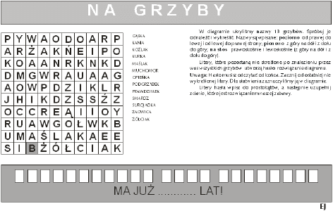 Uwaga! Rozwiązanie diagramu i zagadki zapisz na kartce pocztowej i najpóźniej do 31 grudnia 2001r. przyślij na adres redakcji "Puszczyka" z dopiskiem "NA GRZYBY". Pamiętaj żeby podać swoje imię i nazwisko, adres zamieszkania i wiek. Wśród autorów prawidłowych odpowiedzi rozlosujemy nagrody książkowe. |