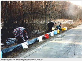 nadzieję, że budowane w naszym kraju kol W wielu miejscach w Polsce miłośnicy przyrody organizują akcje pomocy migrującym płazom. Wzdłuż dróg ustawiane są specjalne płotki oraz wkopywane plastikowe wiaderka, do których wpadają wędrujące płazy. Są one następnie bezpiecznie przenoszone na drugą stronę jezdni. Białowieski Park Narodowy również prowadzi podobne akcje. Także w tym roku, przy współudziale dzieci i młodzieży, będziemy pomagać naszym płazom bezpiecznie dotrzeć do miejsc, w których odbywają gody. Gdy tylko nadejdą pierwsze ciepłe, wiosenne dni ruszamy z akcją. Serdecznie zapraszamy Was do pomocy w tym przedsięwzięciu.