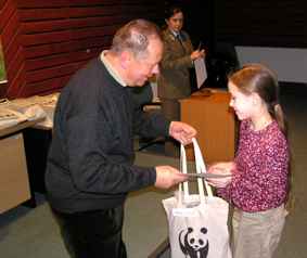 Laureatami konkursu zostali: Ponadto poza konkursem komisja wyróżniła Karolinę Wakuluk z Gimnazjum Gminnego w Siemiatyczach. Zwycięzcom serdecznie gratulujemy! W kwietniu br., na uroczystym ogłoszeniu wyników konkursu, gościliśmy w siedzibie BPN w Białowieży blisko 150 jego uczestników. Autorom najlepszych prac wręczyliśmy nagrody i upominki. Ponad 120 najlepszych prac można było podziwiać na wystawie pokonkursowej. Serdecznie dziękujemy wszystkim uczestnikom konkursu. Specjalne podziękowania składamy dyrekcji szkół i nauczycielom za zaangażowanie i pomoc w tym przedsięwzięciu. Dziękujemy także instytucjom, które ufundowały nagrody. Są to: Narodowy Fundusz Ochrony Środowiska i Gospodarki Wodnej, Multico Oficyna Wydawnicza Sp. z o.o., Bank Pekao S.A., Światowy Fundusz na Rzecz Przyrody (WWF), Ośrodek Edukacji Przyrodniczo-Ekologicznej w Toruniu, Narodowa Fundacja Ochrony Środowiska Biuro Porozumienia Zielone Płuca Polski oraz Stowarzyszenie na Rzecz Ekorozwoju „Agro-Group”. AG Wręczanie nagród laureatom konkursu |