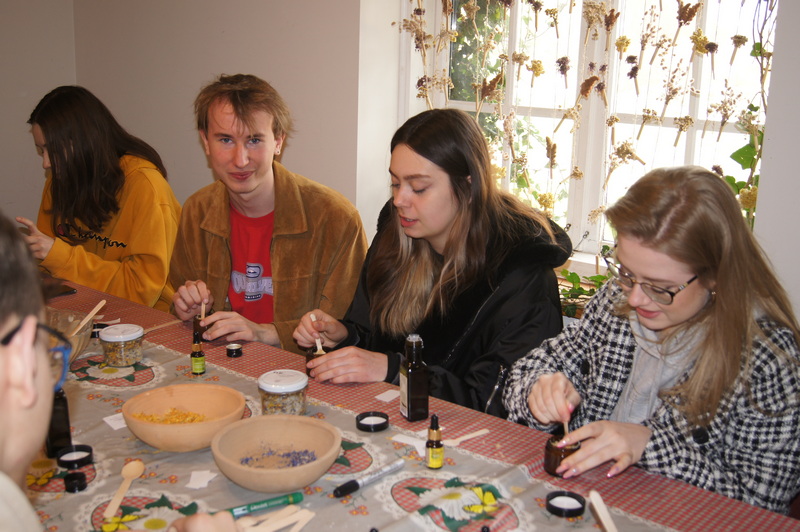 Drugi dzień Obozu spędziliśmy w „Ziołowym Zakątku” w Korycinach, gdzie zwiedziliśmy Podlaski Ogród Botaniczny, od 2011r. o statusie Ogrodu Botanicznego pod opieką merytoryczną dr Mirosława Angielczyka – botanika, założyciela i właściciela tego wyjątkowego obiektu botanicznego. Skorzystaliśmy z jego ogromniej wiedzy botanicznej – nasz przewodnik nie tylko nakreślił historię obiektu i jego znaczenie, ale również oprowadził po Ogrodzie Botanicznym pokazując najbardziej interesujące gatunki roślin użytkowych – na przykład kwitnącą właśnie miodunką ćmę i dwa inne gatunki z tegoż rodzaju. Dowiedzieliśmy się o wymagającej hodowli turówki wonnej oraz przyczynach jej zanikania w przyrodzie. Poznaliśmy też jej „krewną” – turówkę leśną. W „Ziołowym Zakątku” mieliśmy okazję uczestnictwa w warsztatach kosmetycznych, dzięki którym poznaliśmy zastosowanie wielu roślin użytkowych. Wykonaliśmy własnoręcznie sól kąpielową i peelingi do ciała. Po plenerze fotograficznym odbył się panel dyskusyjny zamykający Obóz. Nasze opinie i wrażenia opisaliśmy w ankiecie ewaluacyjnej.
